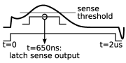 With the current-driving and addressing circuitry in place, it remains only to describe how to detect the presence or absence of a core-switching signal on the sense line. We chose the comparator-based circuit described in [1] (and apparently of unknown German origin):